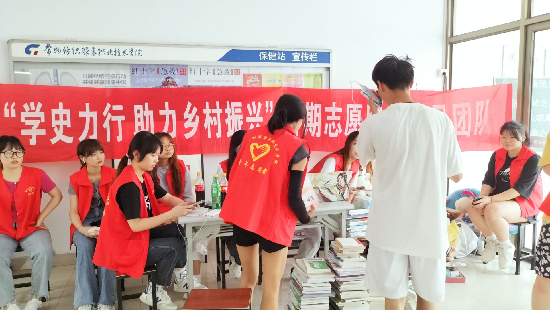 又是一年毕业季,夏日的炽热和蚊虫的干扰并未浇灭志愿者的热情,为建设资源节约型社会,提升大学生的环保意识和公益意识,秉承着“物尽其用,知识循环”的理念,常州纺织服装职业技术学院“学史力行,助力乡村振兴”团队成员穿着红马甲的身影穿梭奔波于校园之内,在人文学院团委书记左建航的指导下,于暑期放假之前开展了2021年“博爱青春”暨暑期社会实践之“纸短情长,书墨留香”回收旧书活动。